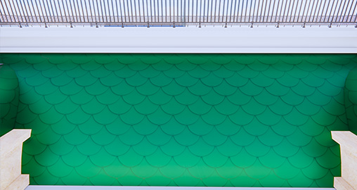 此為惱包奧萊水世界項目,此屋面系統采用的是新型建筑材料金屬復合瓦鋪設...
